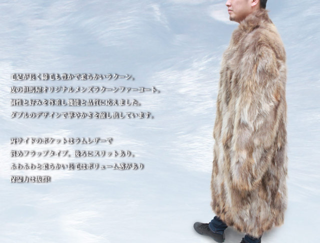 | 製品名: | 皮の但馬屋オリジナル ラクーン毛皮 メンズロングコート 3004 |