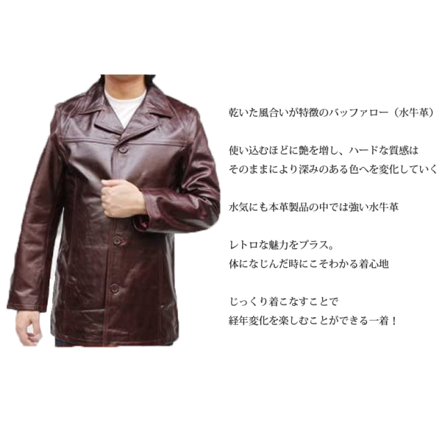 M:着丈74cm肩幅42cm袖丈61cm胸囲100cmL:着丈75cm肩幅44cm袖丈62cm胸囲104cm2L:着丈76cm肩幅46cm袖丈63cm胸囲108cm3L:着丈77cm肩幅48cm袖丈63cm胸囲112cm素材:バッファローカラー:ブラック・ワイン乾いた風合いが特徴のバッファロー革使用使い込むほどに艶を増し、ハードな質感はそのままにより深みのある色へを変化していくしなやかで軽く強いカバーオールレザージャケットレトロな魅力をプラス。体になじんだ時にこそわかる着やすさ。じっくり着こなすことで何とも言えない味わいを称える表情を描き出す!個性派レザー!