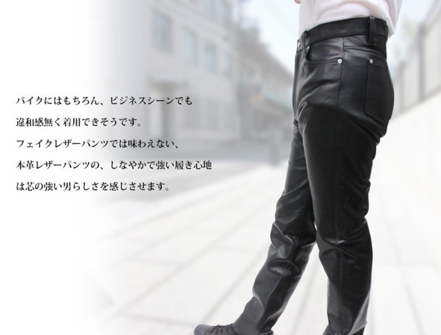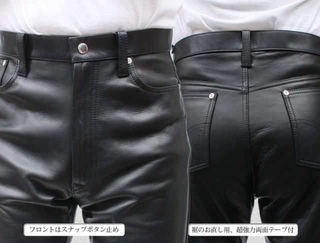 柔らかくて強いカウオイル素材を使用。すっきりとした印象の強いレザーパンツなので、バイクにはもちろん、ビジネスシーンでも違和感無く着用できそうです。フェイクレザーパンツでは味わえない、本革レザーパンツの、しなやかで強い履き心地は芯の強い男らしさを感じさせます。Gパンタイプのレザーパンツだから、履きなれた履き心地を味わえます。シンプルなプレーンタイプのレザーパンツなのでスタイルを選ばずお履き頂けます。オススメのメンズレザーパンツ!裾のお直し用、超強力両面テープ付です。こちらは日本製になります。